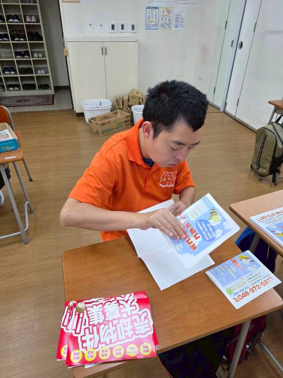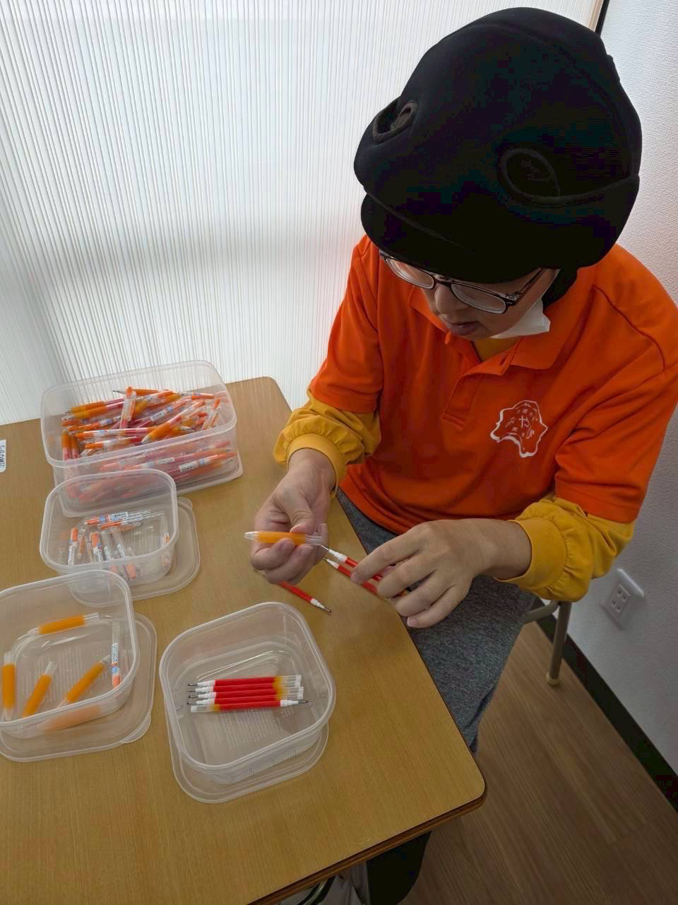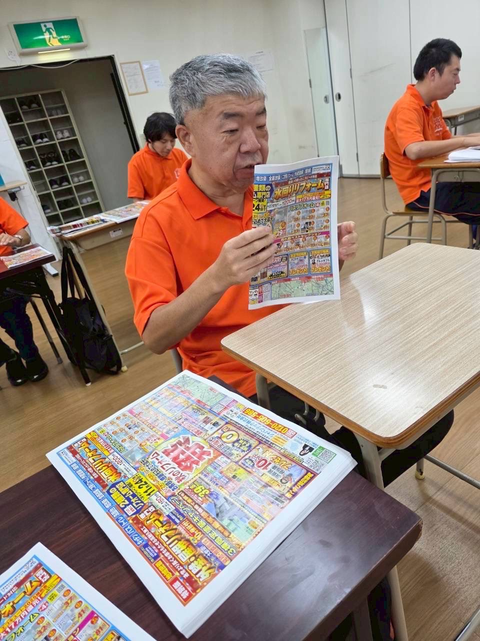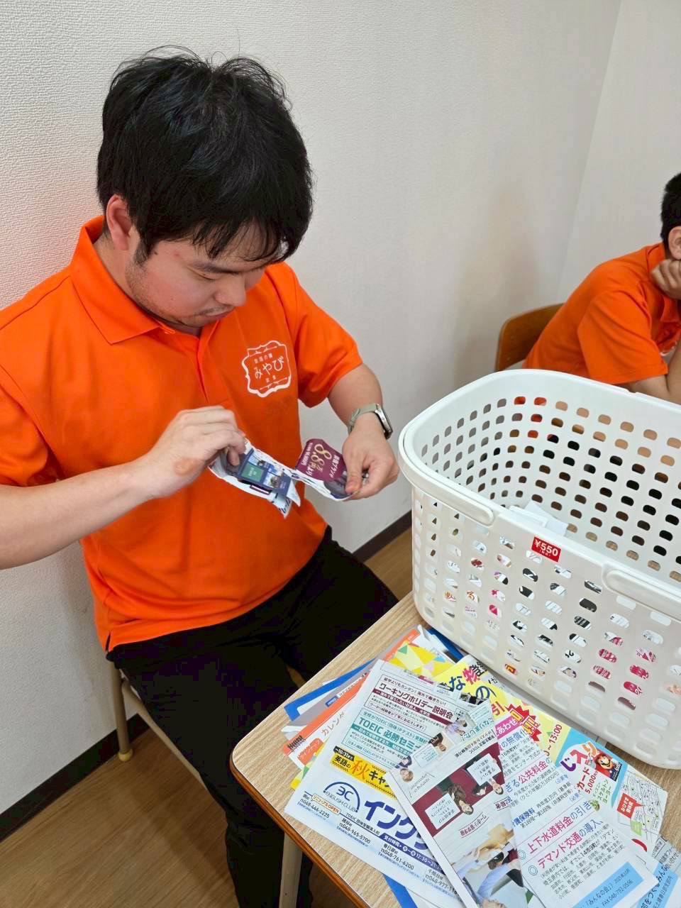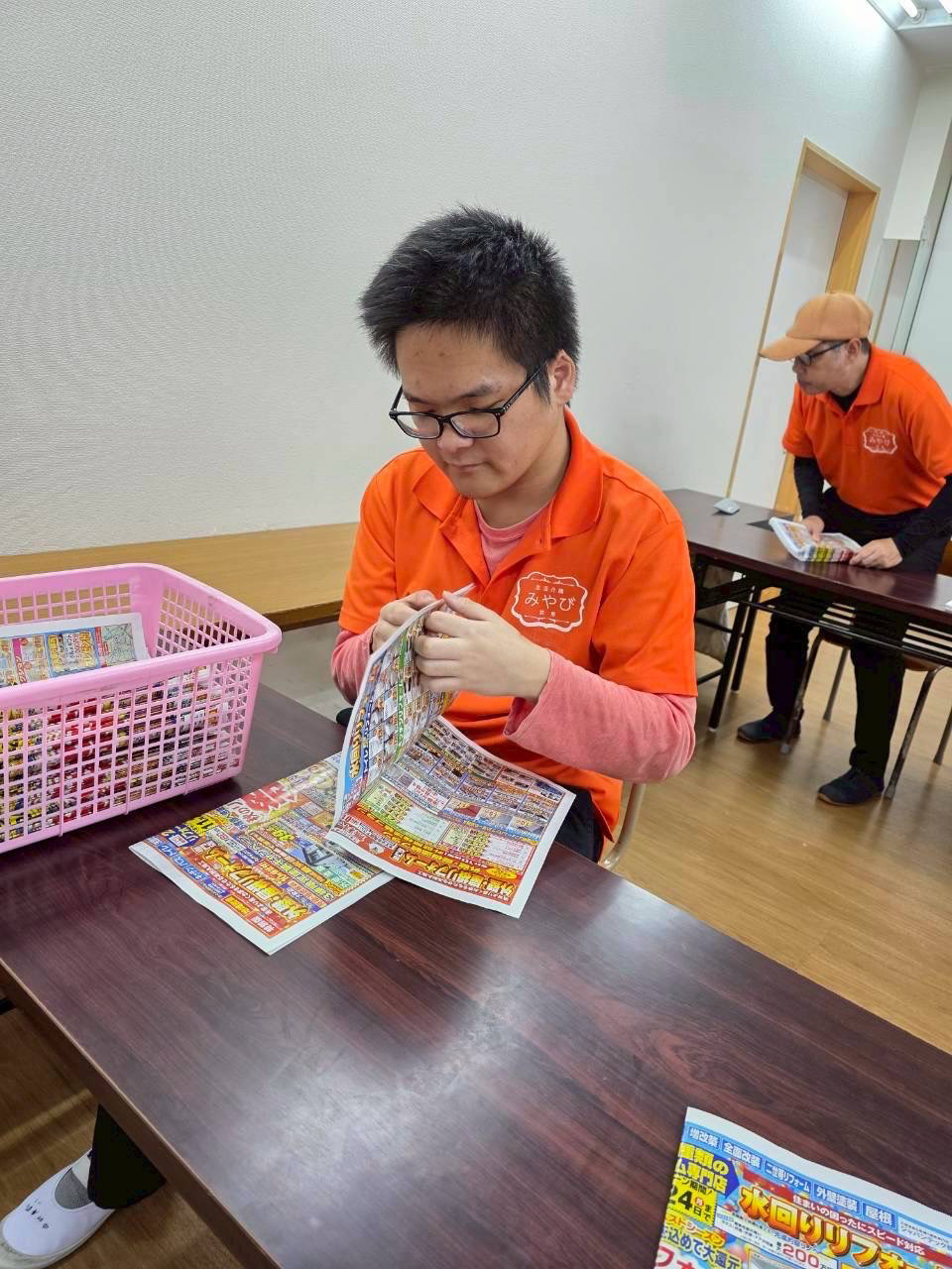 午後のお仕事はご利用者様一人一人に合わせたお仕事を取り入れてます。 写真のお仕事はキッチン清掃(食べ終わった食器洗い)・紙ちぎり・ボールペン組み立て・ポスティングのチラシセット・チラシ折の様子です。皆さんとても意欲的に取り組まれています。